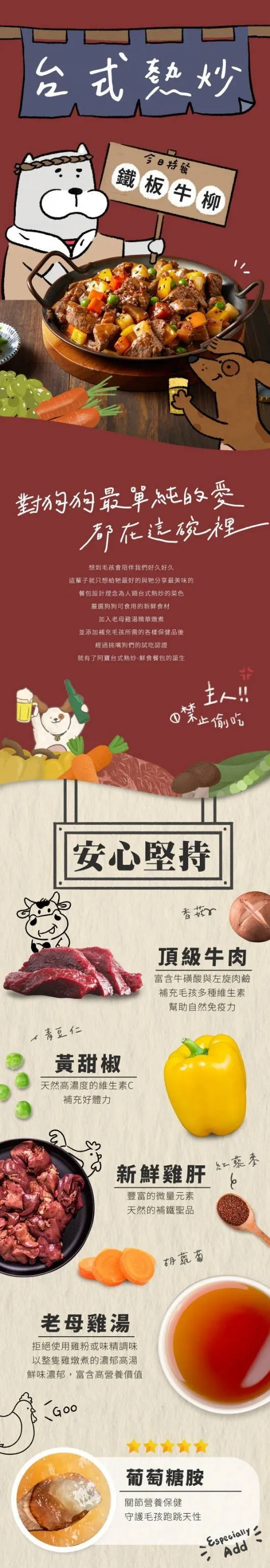 牛肉、牛筋、紅蘿蔔、黃甜椒、馬鈴薯、青豆仁、香菇、雞肝、紅藜麥、季節時蔬、雞湯、椰子油、葡萄糖胺、綜合維生素礦物質