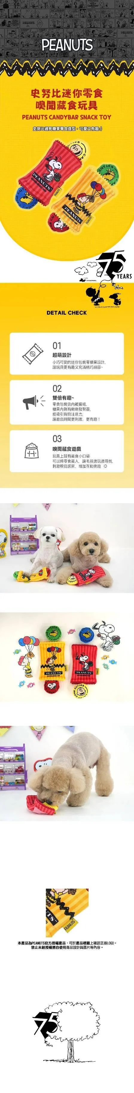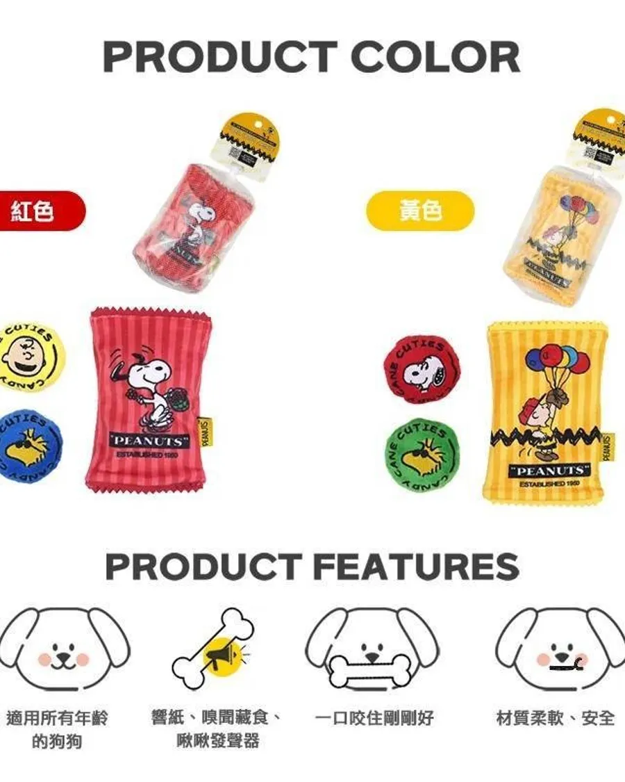 史努比迷你零食嗅聞藏食玩具,零食包裝袋內藏響紙、糖果內含啾啾發聲器,吸引狗狗注意力並提升專注度。兼具嗅聞與玩樂功能,讓毛孩在遊戲中釋放壓力、動腦找零食,帶來更刺激又有趣的互動時光。